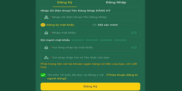- Điền đầy đủ thông tin: Tên đăng nhập, mật khẩu, số điện thoại, họ và tên thật.